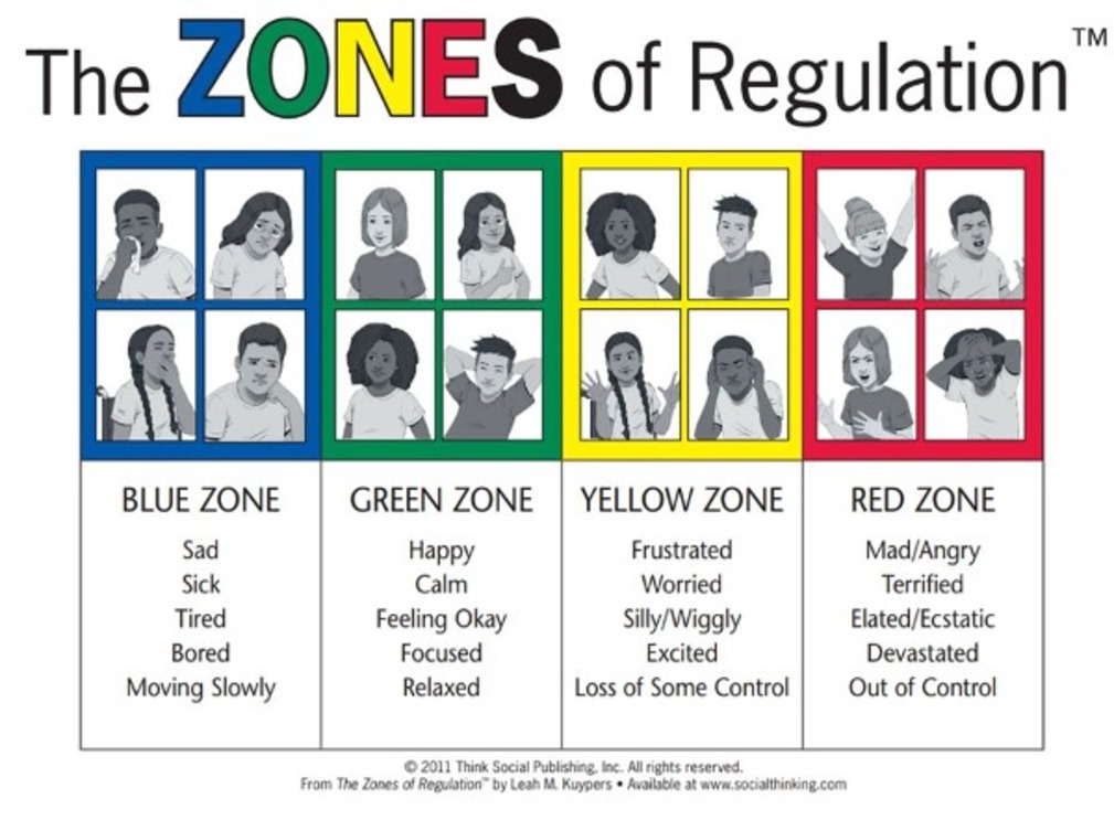 Zones of Regulation: A curriculum designed to teach children self-regulation skills by categorizing emotions and states of alertness into four coloured zones.